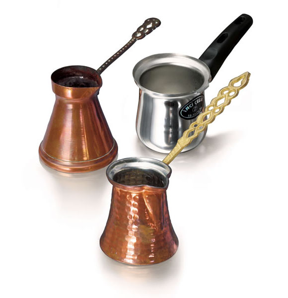 煮土耳其咖啡,用的是一只長柄的,材質(zhì)為黃銅或銅,內(nèi)部鍍錫、上端邊緣稍向外歪曲的壺。這種壺在土耳其被稱為“杰士威”,美國商人稱它為“伊芙利克”。在希臘則被簡化為“必奇”。土耳其式咖啡壺制出的咖啡很嗆口,這正是咖啡最“原始”的味道。 煮土耳其咖啡之前,應(yīng)先用熱水洗凈所用的土耳其咖啡杯。咖啡煮好之后會泛起一層泡沫,向杯中倒入咖啡時,要連同泡沫一起倒入在每一杯之中,這是沖煮咖啡專業(yè)的象征,也代表著一種榮譽(yù)和時尚。